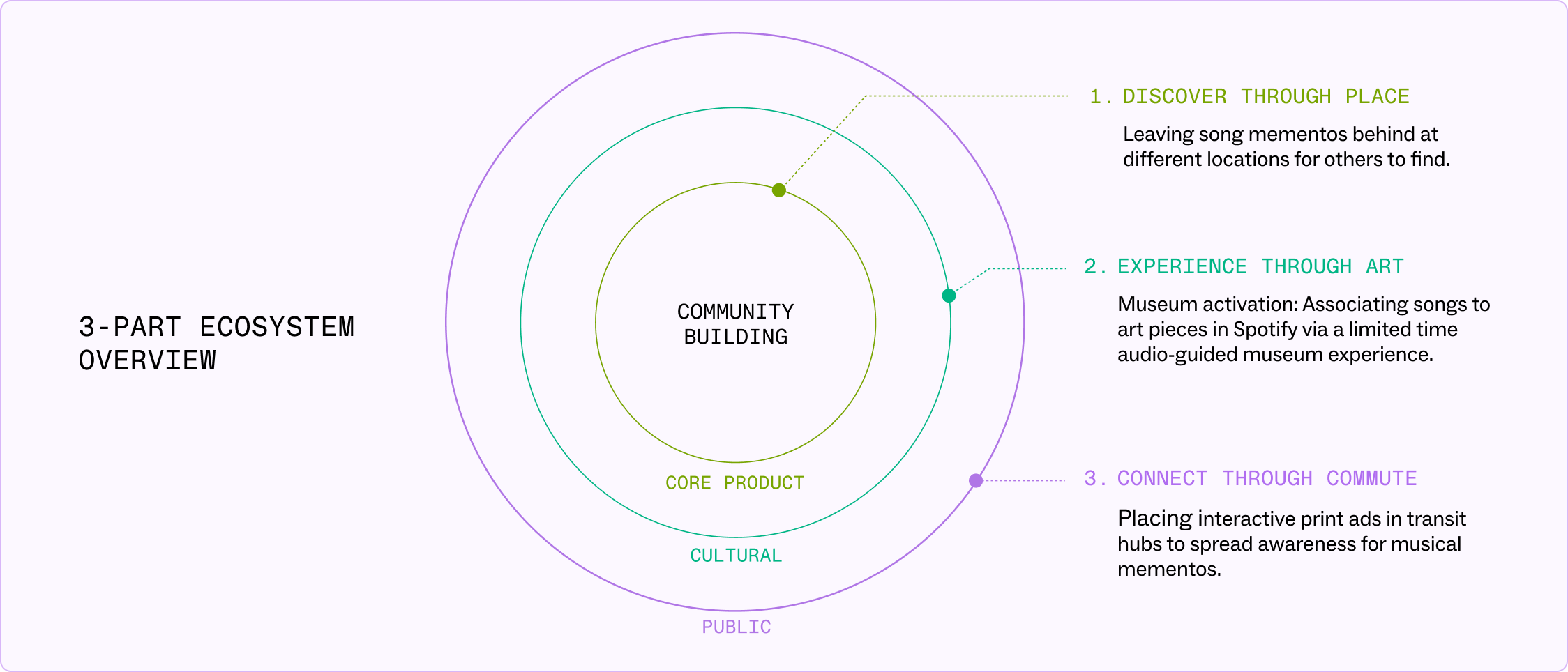 Our 3-part solution, consisting of an app feature, a museum-based event campaign, and the marketing strategy to ease users into the idea that where you are influences what you hear. The campaign expands from a single in-app feature into a cultural and public experience.