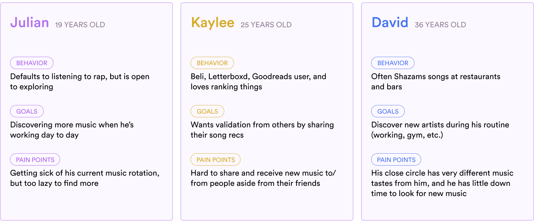 We created a variety of user personas to better understand the target users and mapped out their pain points in their existing audio discovery process.
